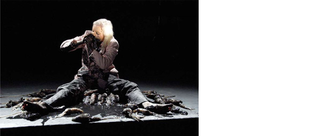 The young woman sits on a darkened stage. Her blond hair, light skin and the pink felt suit she is wearing make her conspicuous in the darkness. She grabs an octopus, sucks out its ink and stains herself with the dark color. She then reaches for the next octopus and the next one, sucking and spitting and increasingly melting into the background. She needs 40 animals before her felt suit, face, hands, feet, even hair are completely soaked in dark sepia and the artist is nearly no longer perceptible: She has vanished in the black ink.