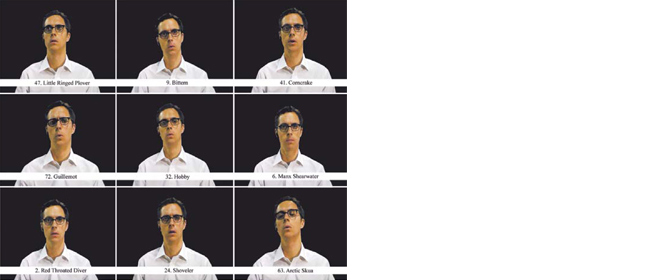 The title of Marcus Coates’ 2001 video installation, “A Guide To The British Non Passerines,” plays on the long and venerable tradition of ornithological handbooks – a similarly-titled book would offer a catalogue-like overview of all bird species native to Great Britain not classified as “songbirds.” Following its transformation, by Coates, into an audio-visual medium this title, which at first seems quite obvious, gains additional levels of meaning. In the 41 minute video, the artist can be seen in a typical TV head-and-shoulder shot wearing a white shirt against a black background and heard imitating the calls of 86 different bird species. As each bird is imitated, its scientific name is faded in.