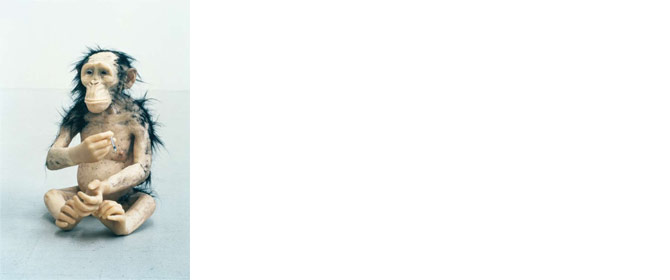 What a pitiful creature – whoever is not overcome with compassion at this sight has no heart at all. After seeing this abused creature, feelings well up which are defining for humans: empathy, care, compassion. And yet British sculptor John Isaacs has created a rather hideous being. Apparently a chimpanzee, its fur is thin and the few strands of hair it has are standing up and disheveled. The animal sits on the floor like an infant, its glance, which does not betray its age, staring off into emptiness. Its features seem to emanate melancholy. Or are we merely reading that into the animal face?