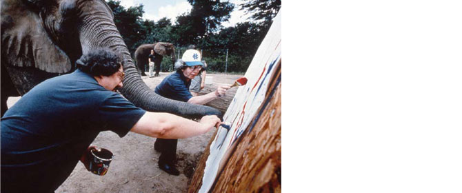 The New York-based Russian art duo, Vitaly Komar and Alexander Melamid, who now work independently, taught domesticated elephants to paint. This multi-year project, which began in 1995 and has been concluded, used the resulting pictures to finance an elephant protection project they have been running since then in Thailand. For centuries, elephants have been used to haul wood; following a logging prohibition, they lost their “jobs” and therefore became useless to humans. The art project provided an alternative source of income for the keepers of these endangered elephants and thus for the elephants themselves. What began as a satirical commentary on the art market quickly developed into a mutually profitable business.