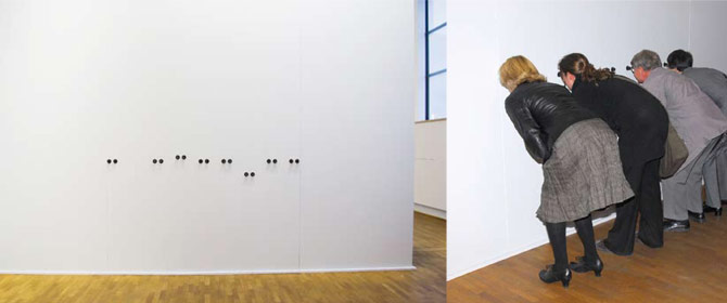 In her multi-part work “The Refusal,” British photographer Jo Longhurst has produced a photographic monument to her own whippet as well as the entire race of whippets. In her large-format whippet portraits she examines the idea of perfection with reference to racial standards as well as the identity construction of breeders, carried out via dogs. In “Sightsound,” however, she has created an installation which requires a certain type of becoming animal from viewers: A number of pairs of eye-holes set approximately at breast-level before which observers must bend down and forward. This stooping forces them out of their normal upright position to adopt a more horizontal view. For a long time, walking upright with a glance potentially focused upwards represented the most important difference between humans and animals and is even today still occasionally cited as a hierarchically-conceived unique feature of humans.