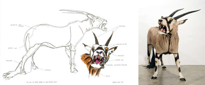 Onto the body of a lion she has attached the skin of one of its prey, an oryxantelope. Although certain adaptations in leg length or facial form had to be made, the king-of-the-forest’s new clothes seem to suit him. Even the splendid horns and the beautiful markings on the fur look quite good on the lion. Alongside the advantage for hunting which this new look would bring with it, allowing the predator to close in on the antelope herd unnoticed (at any rate if the lion were also able to imitate the gait and the smell of the ruminant), it would also derive an aesthetic benefit. Who knows – perhaps potential sexual partners would be more interested in this unusual exemplar than in its sand-yellow competitors? Perhaps, they might instead prefer to devour him.